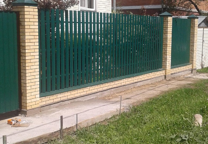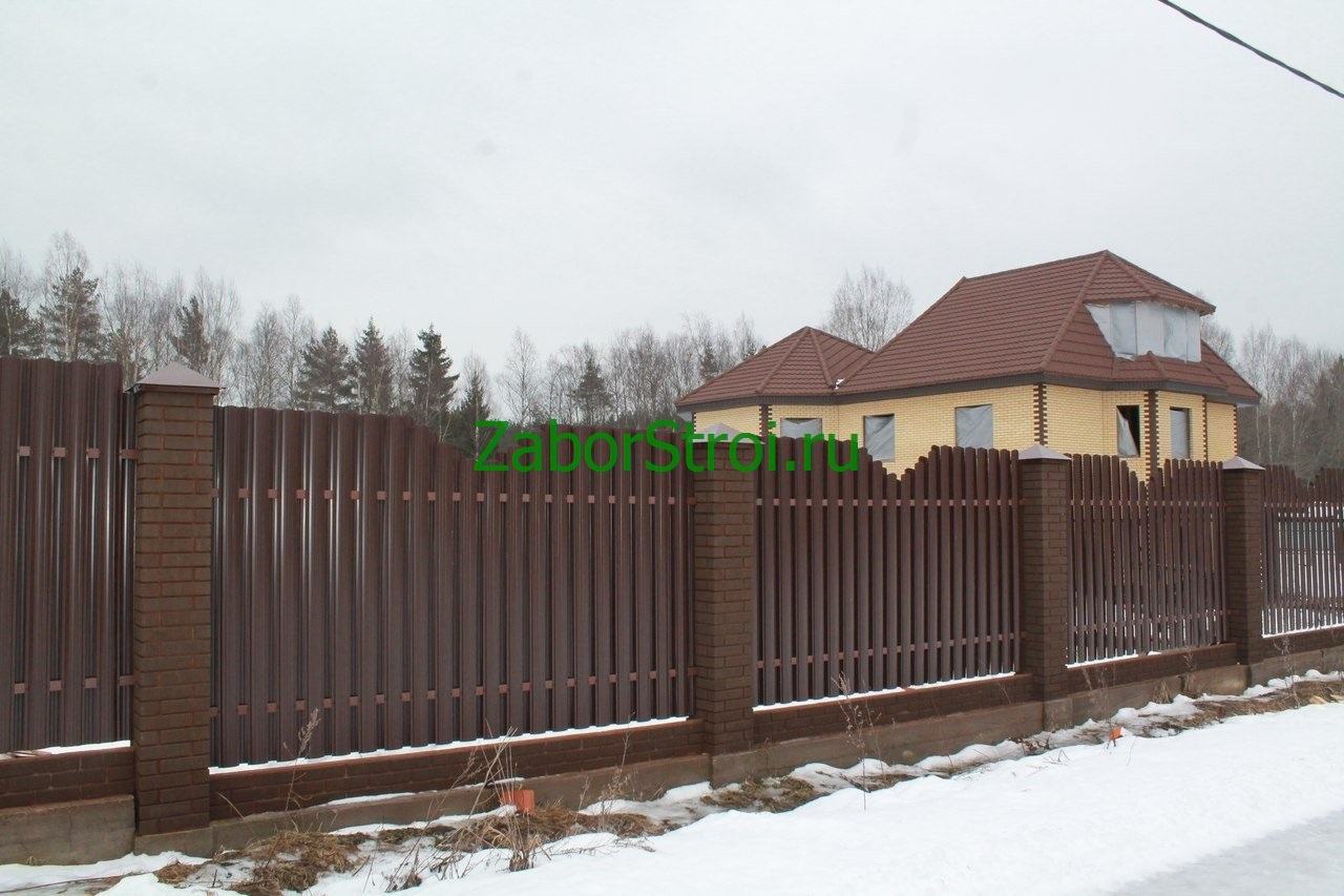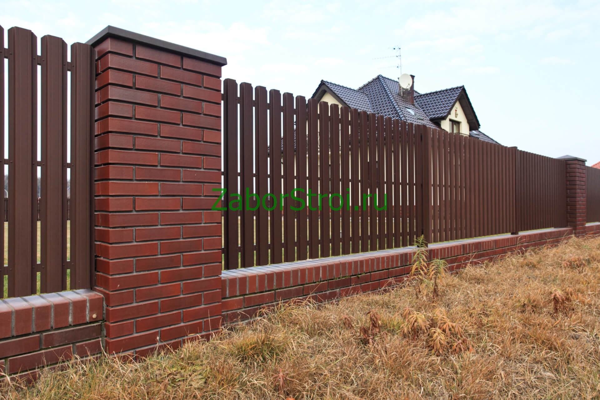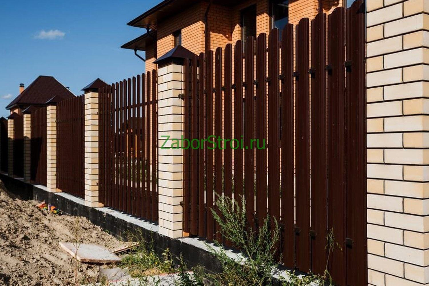 Заборы из евроштакетника с кирпичными столбами пример 9