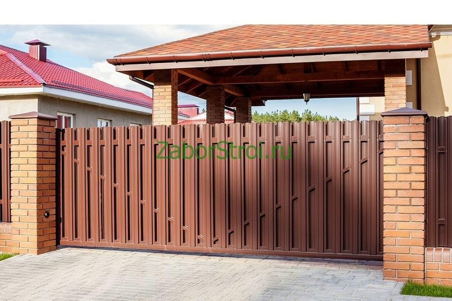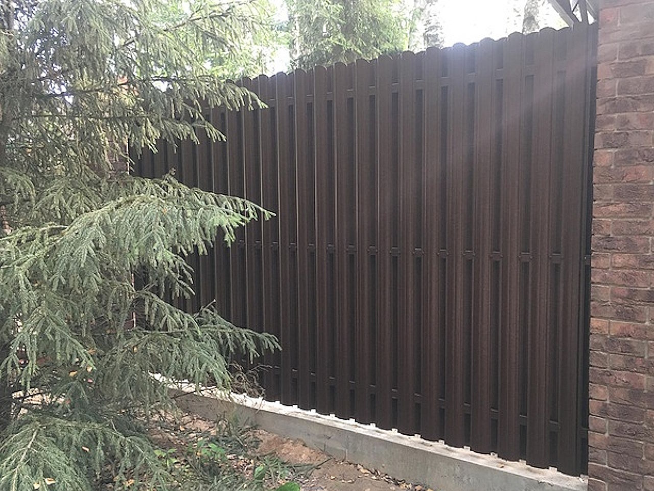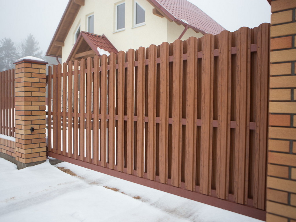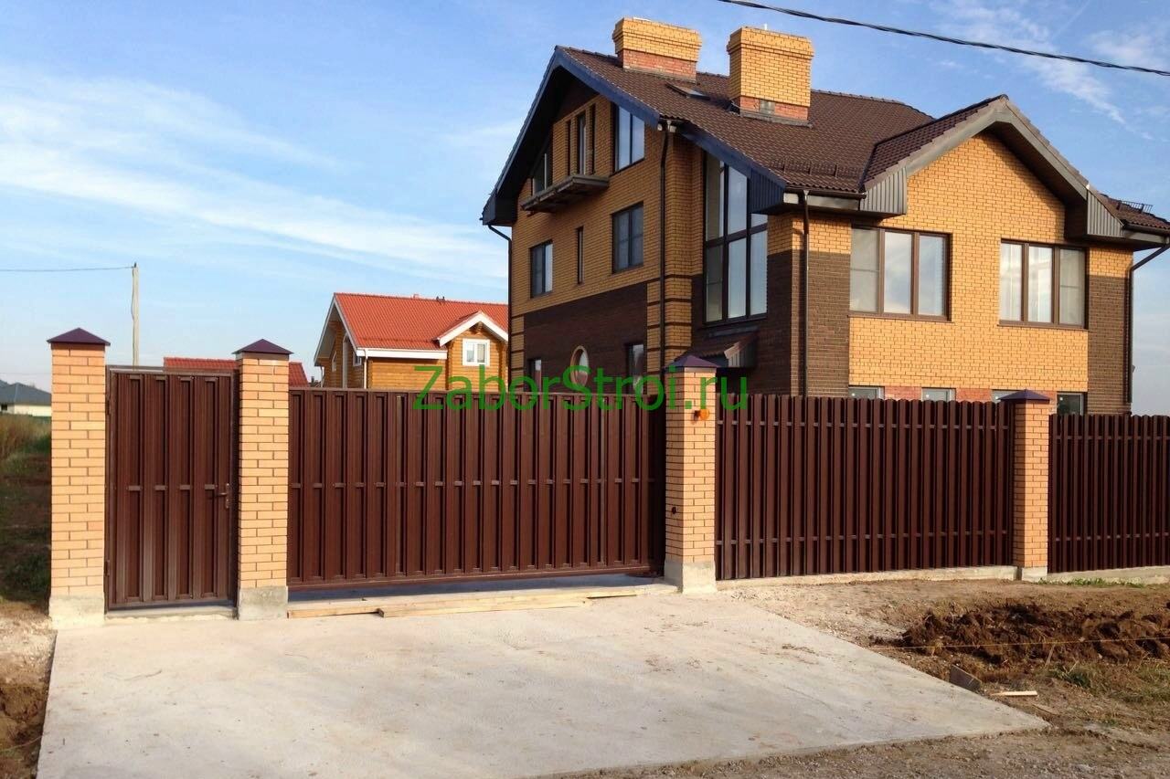 Заборы из евроштакетника с кирпичными столбами пример 9